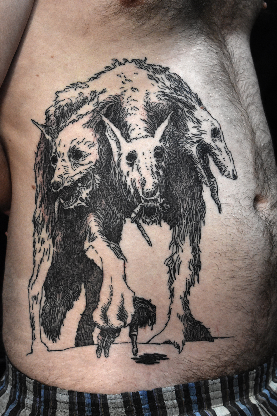 L’idée de base c’est un cerbère badass, lévrier afghan, en s’inspirant de Mike dans Hunter x Hunter. Après discussion, on a décidé de reprendre la pose d’une case de la bd pour que la référence soit plus évidente.