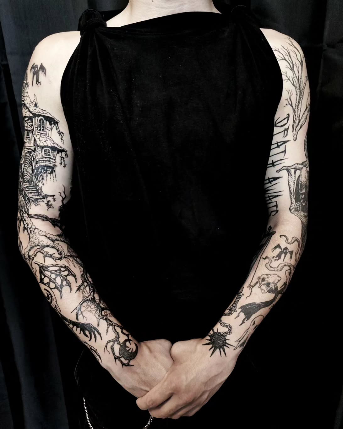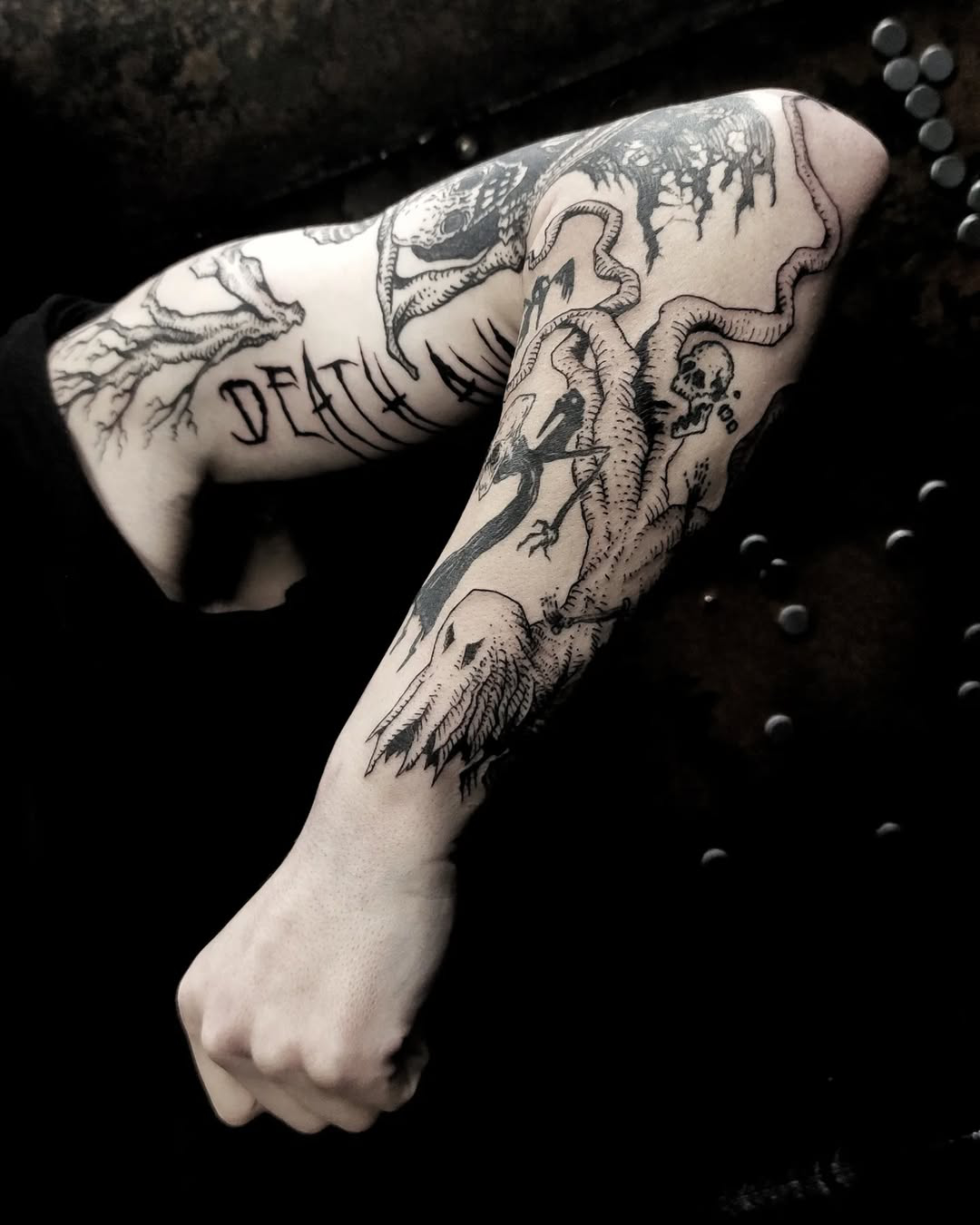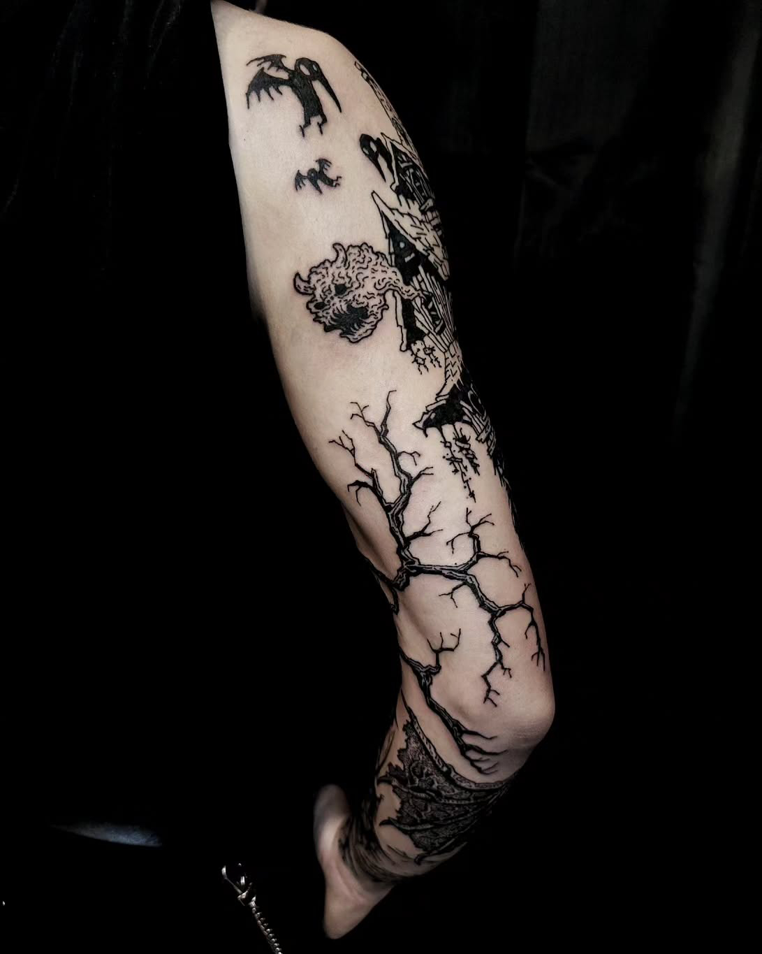 Sam est venu me voir de Lyon une première fois pour couvrir son bras gauche de plusieurs flashs que j’avais dessiné et qui lui avaient plu, ainsi que de quelques motifs sur mesure.