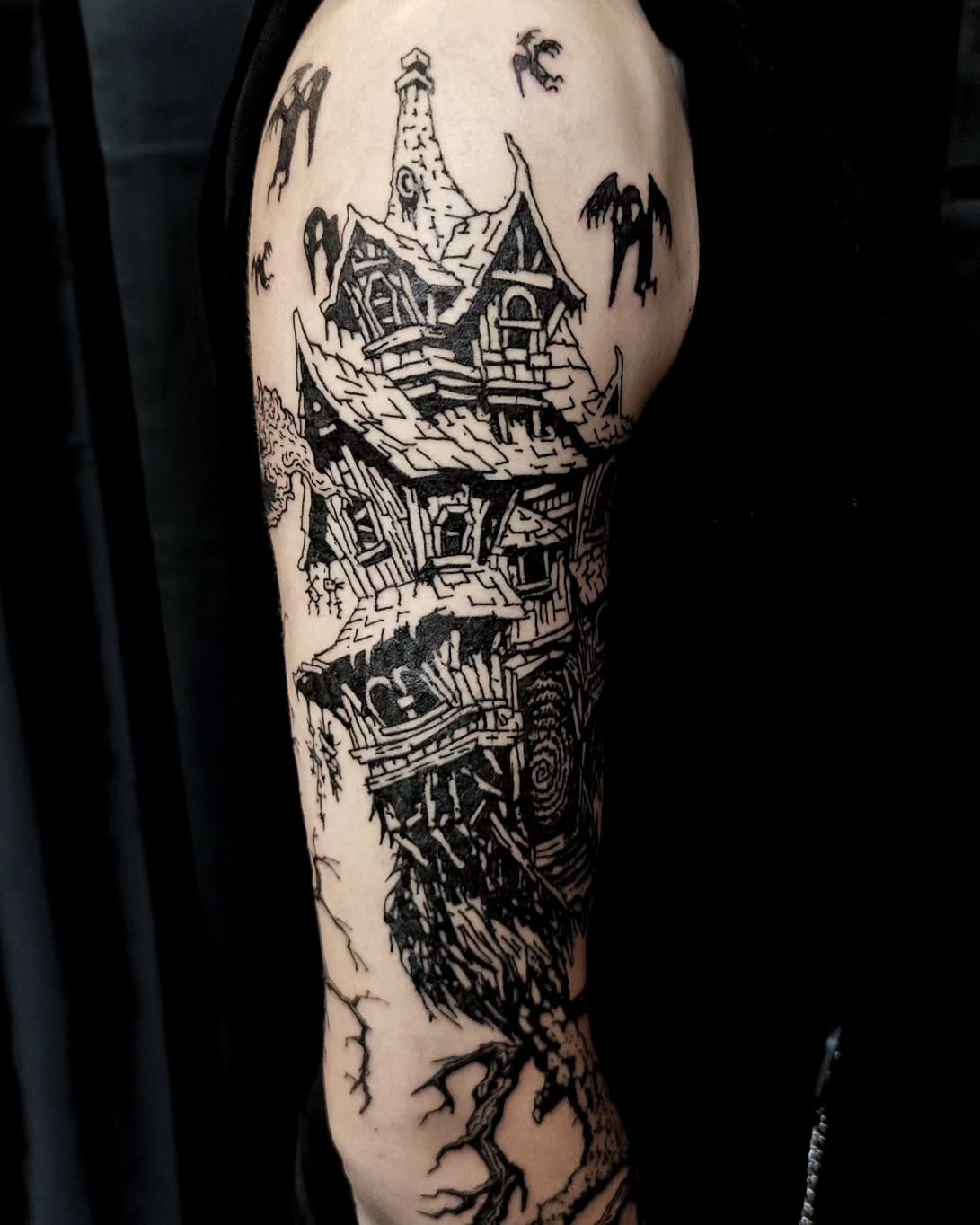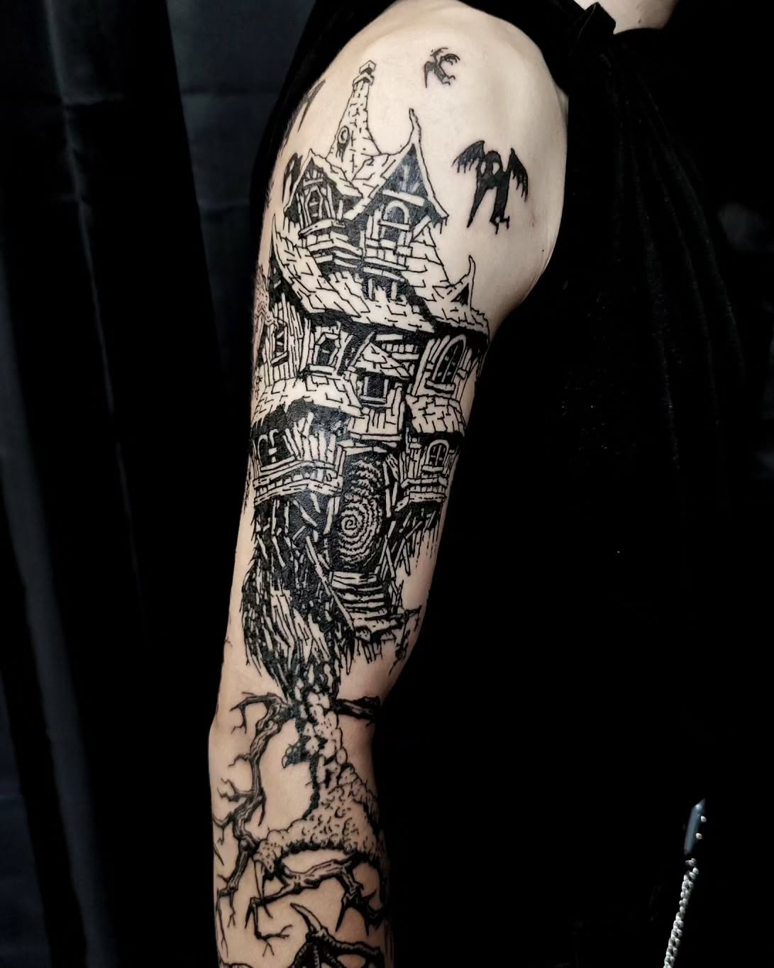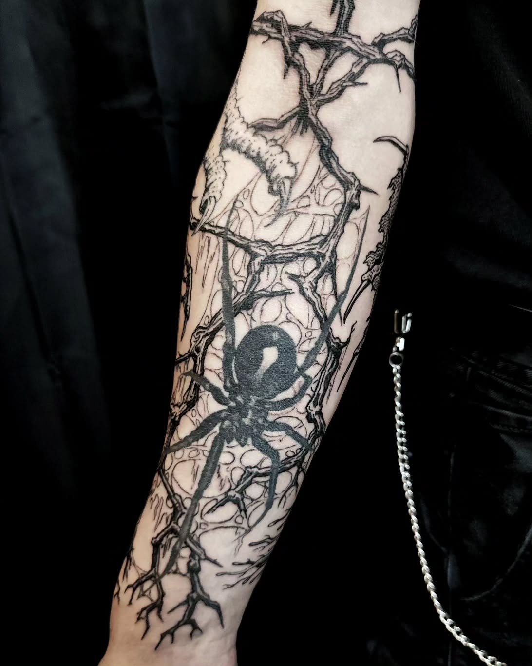 Sam est venu me voir de Lyon une première fois pour couvrir son bras gauche de plusieurs flashs que j’avais dessiné et qui lui avaient plu, ainsi que de quelques motifs sur mesure.