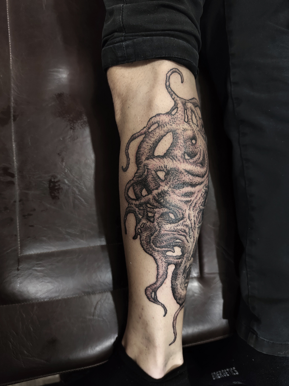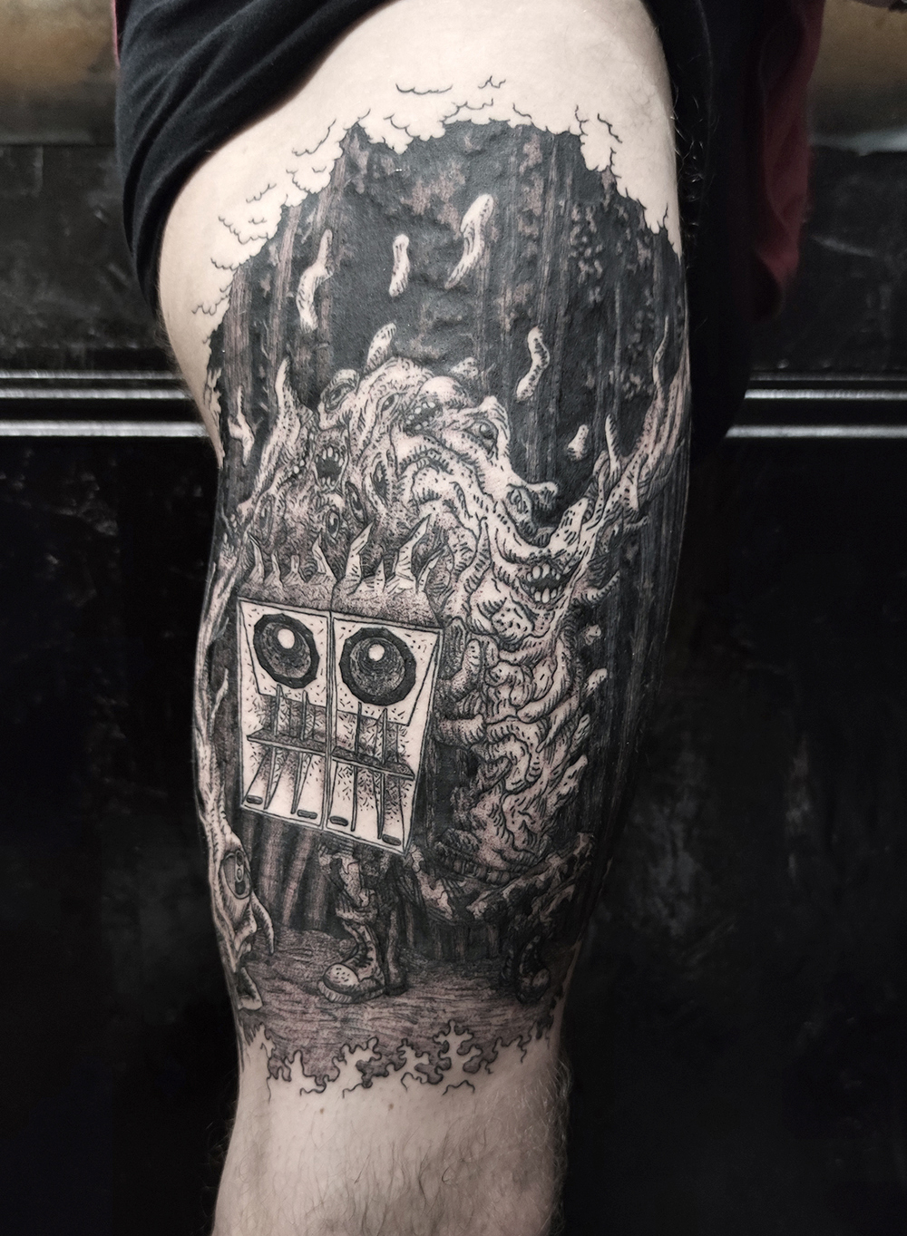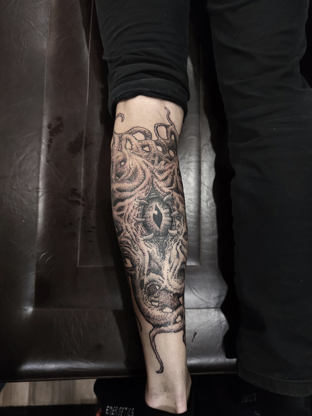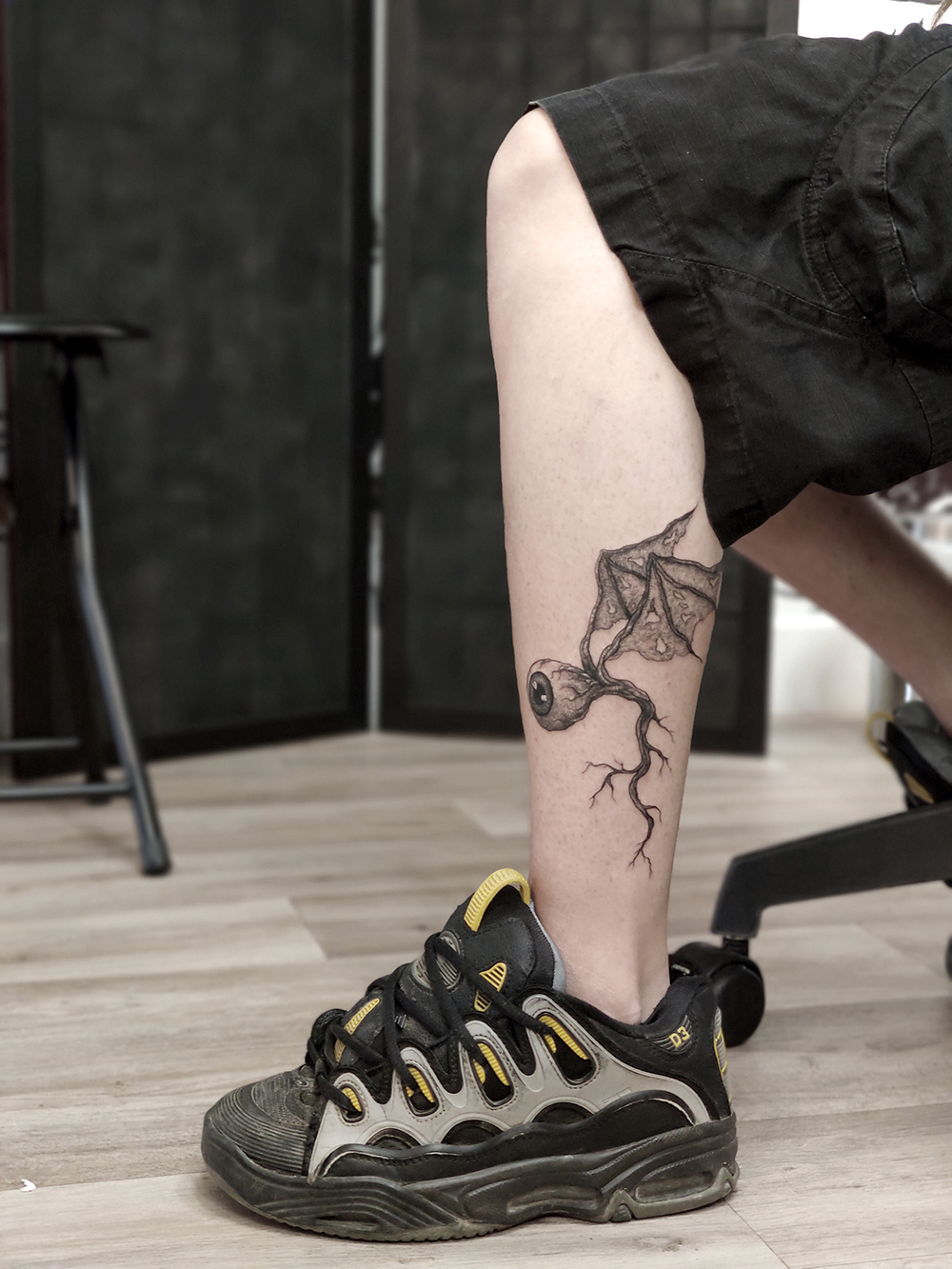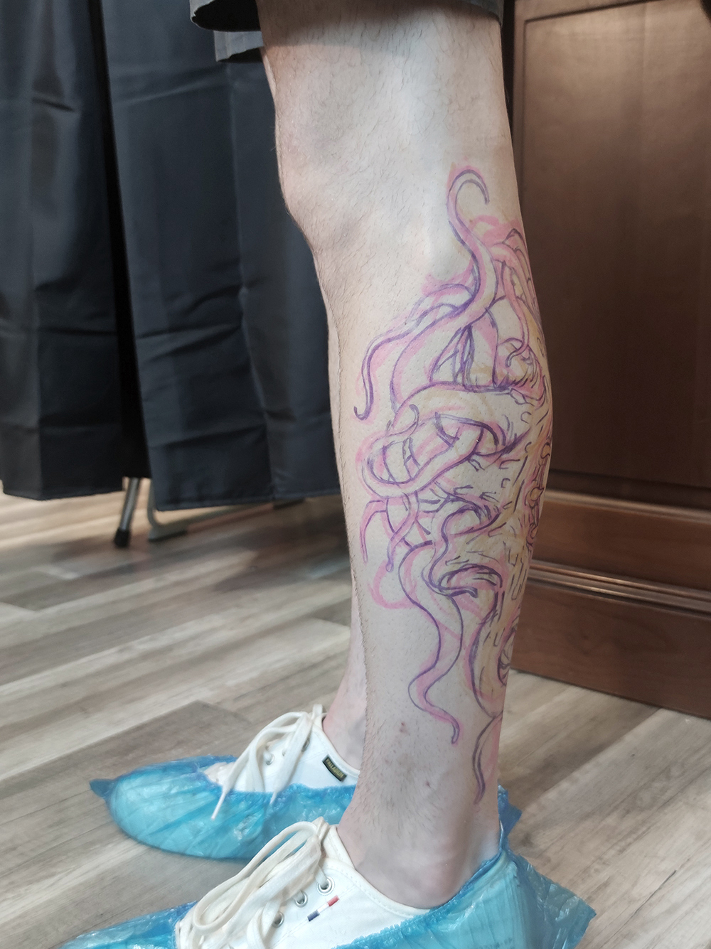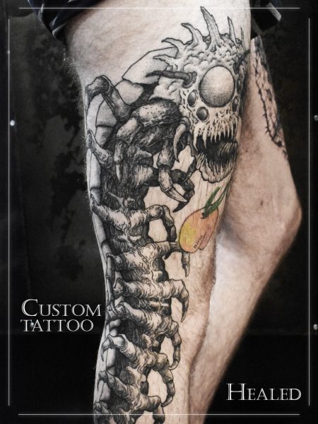 J’ai quelques thèmes de prédilection, mais je suis ouvert à tout type de projet de tatouage (j’aime faire autre chose que des monstres de temps en temps ^^). J’ai une préférence pour les projets au long cours : bras, dos, jambes complèt.e.s etc.