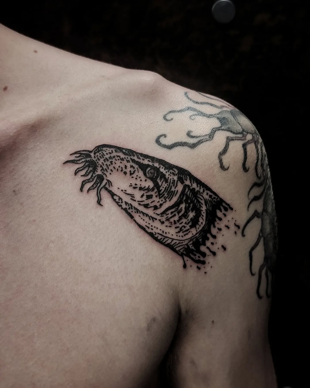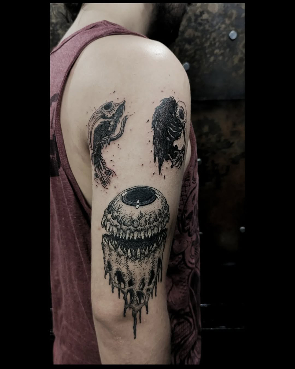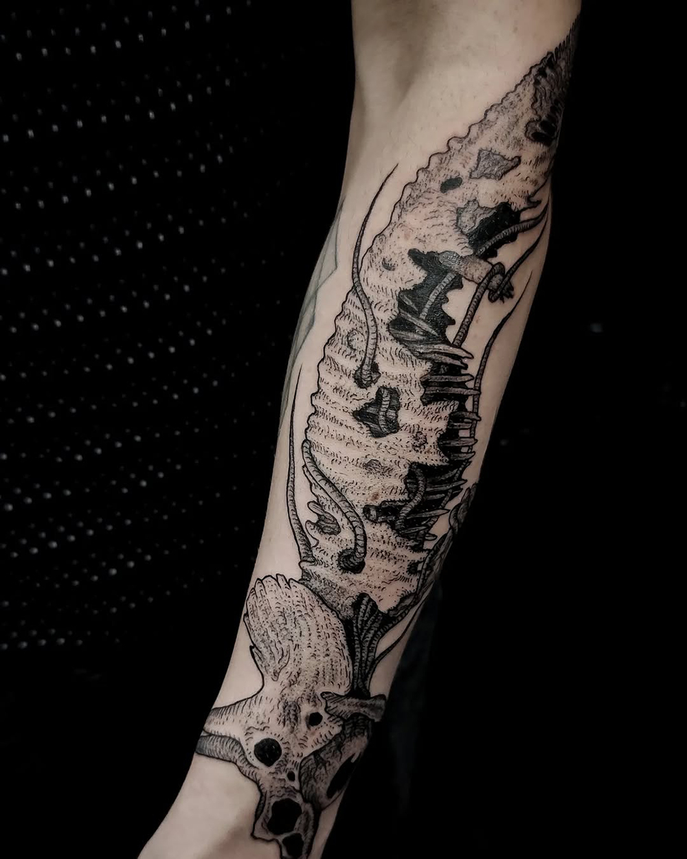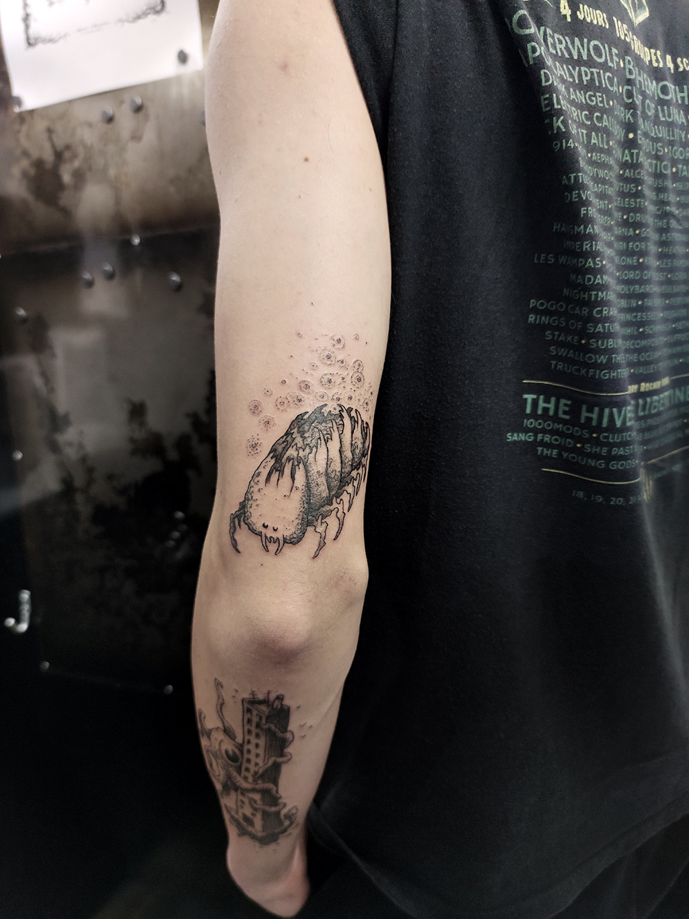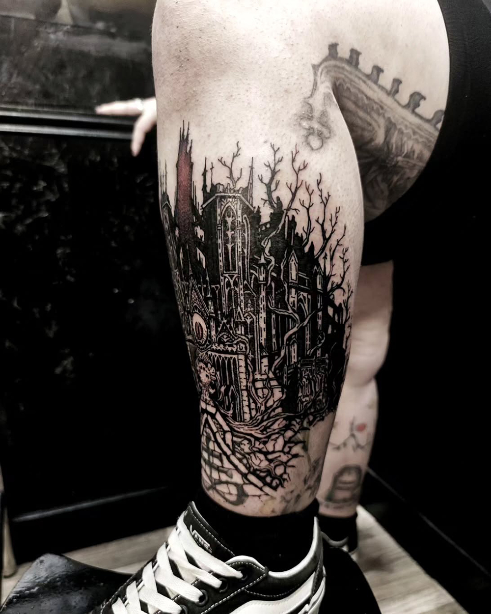 J’ai quelques thèmes de prédilection, mais je suis ouvert à tout type de projet de tatouage (j’aime faire autre chose que des monstres de temps en temps ^^). J’ai une préférence pour les projets au long cours : bras, dos, jambes complèt.e.s etc.