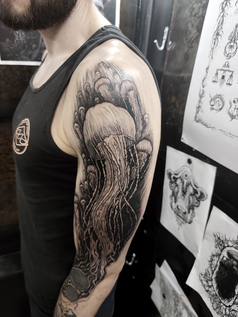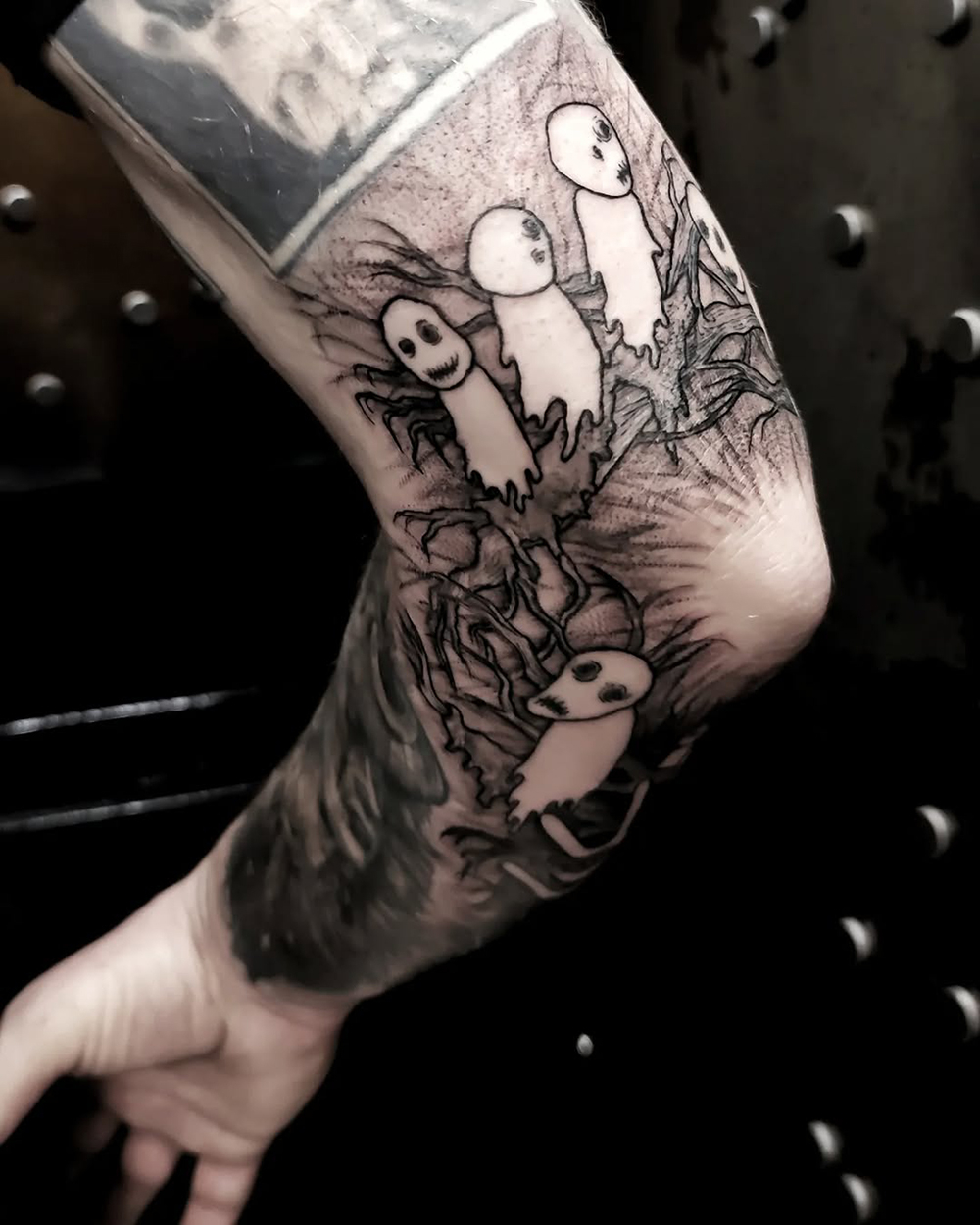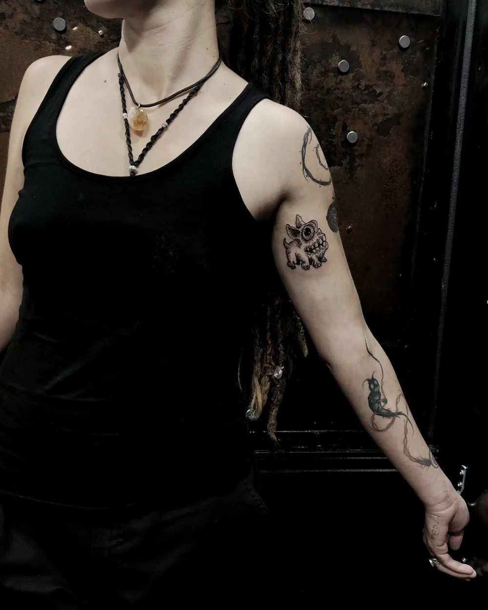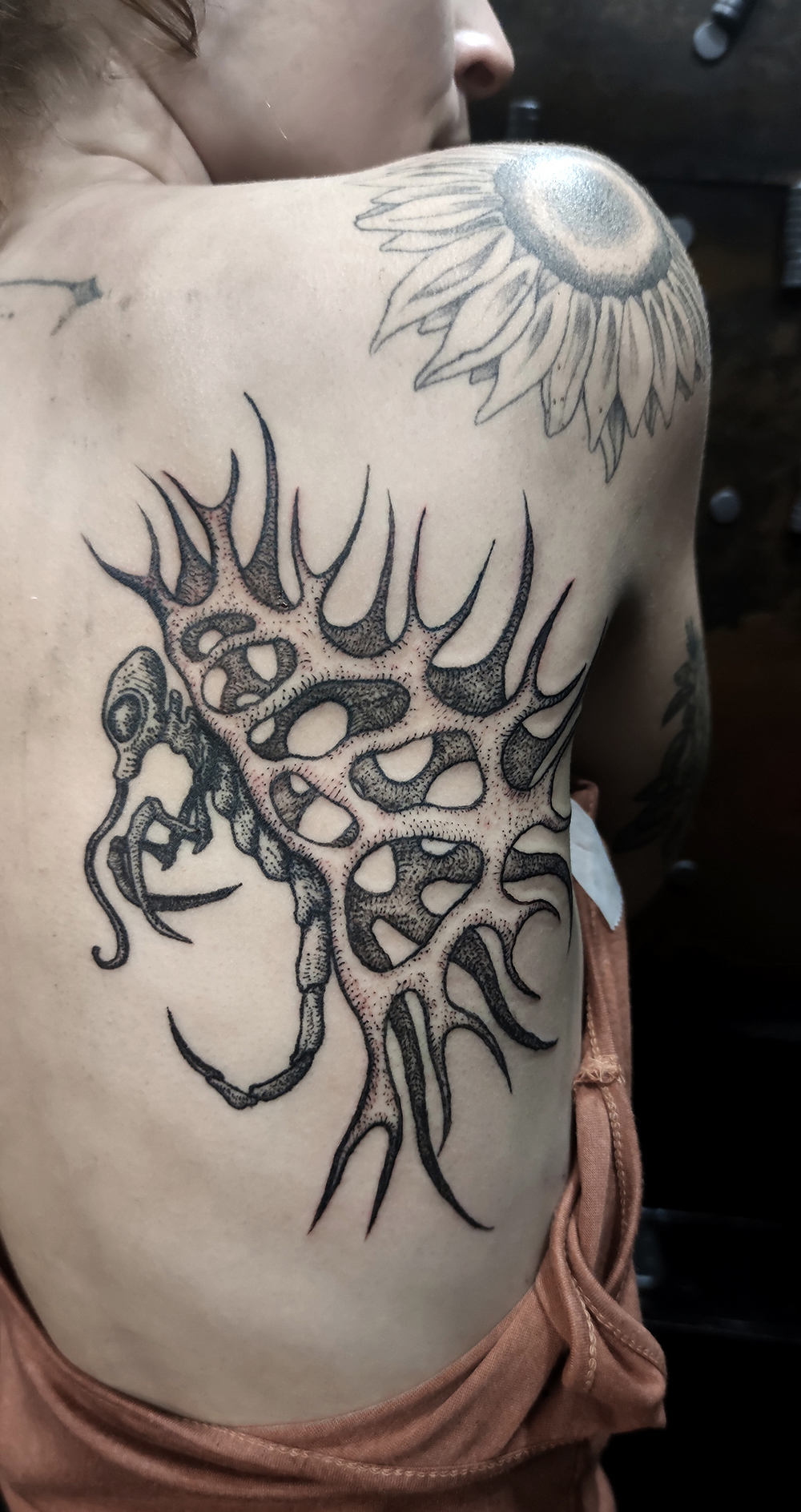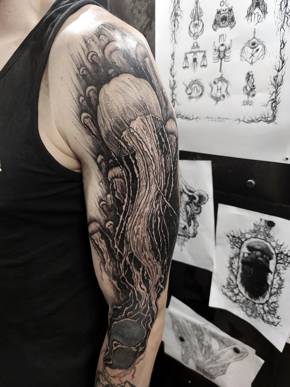 J’ai quelques thèmes de prédilection, mais je suis ouvert à tout type de projet de tatouage (j’aime faire autre chose que des monstres de temps en temps ^^). J’ai une préférence pour les projets au long cours : bras, dos, jambes complèt.e.s etc.