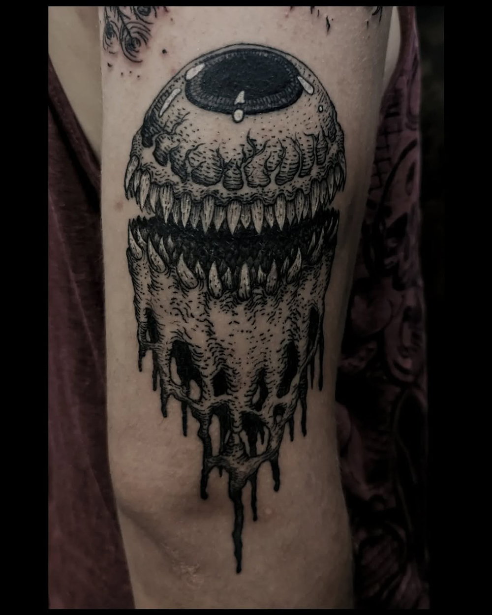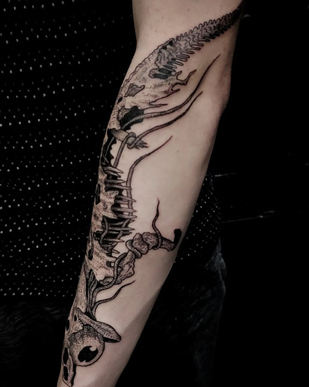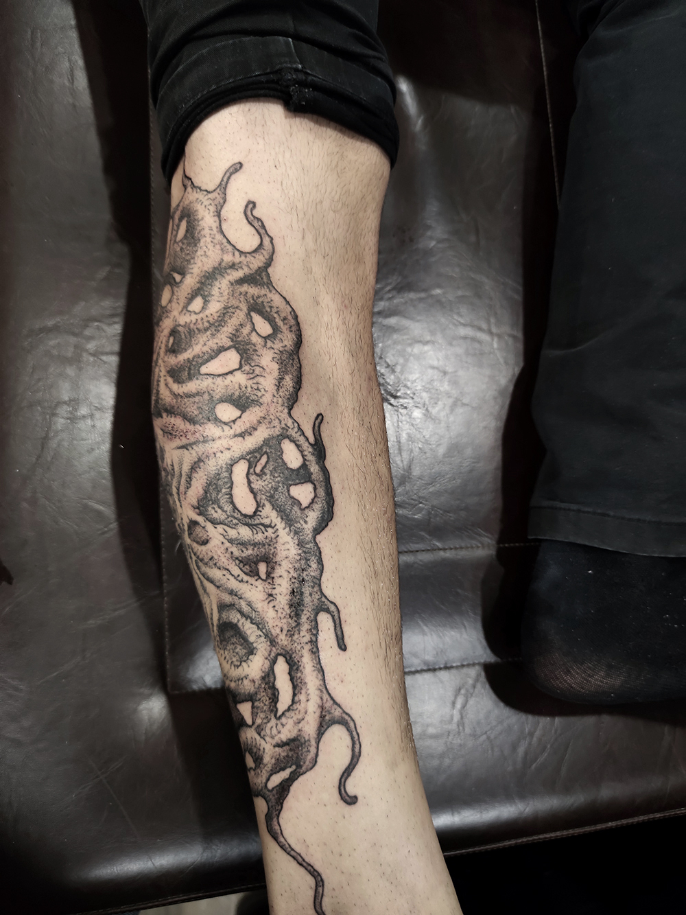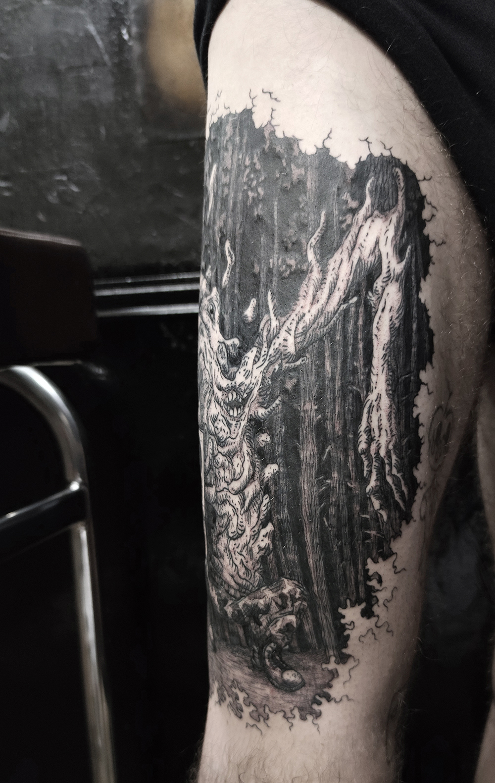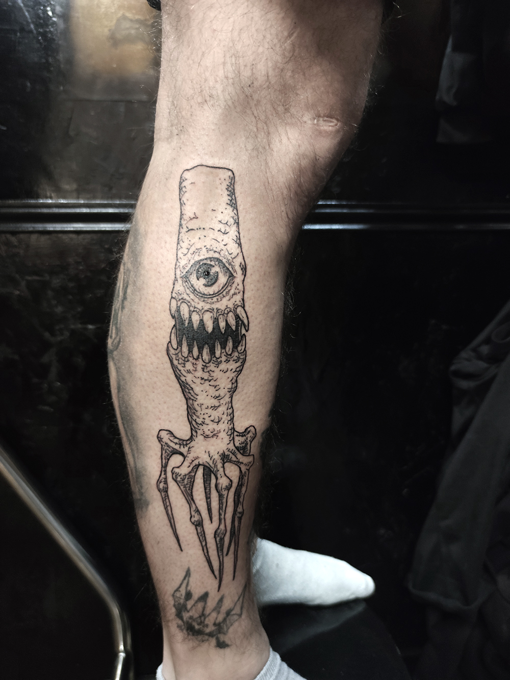 J’ai quelques thèmes de prédilection, mais je suis ouvert à tout type de projet de tatouage (j’aime faire autre chose que des monstres de temps en temps ^^). J’ai une préférence pour les projets au long cours : bras, dos, jambes complèt.e.s etc.