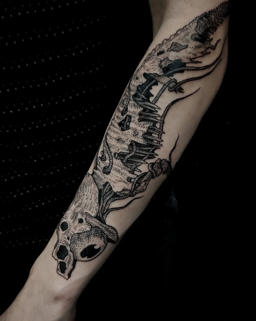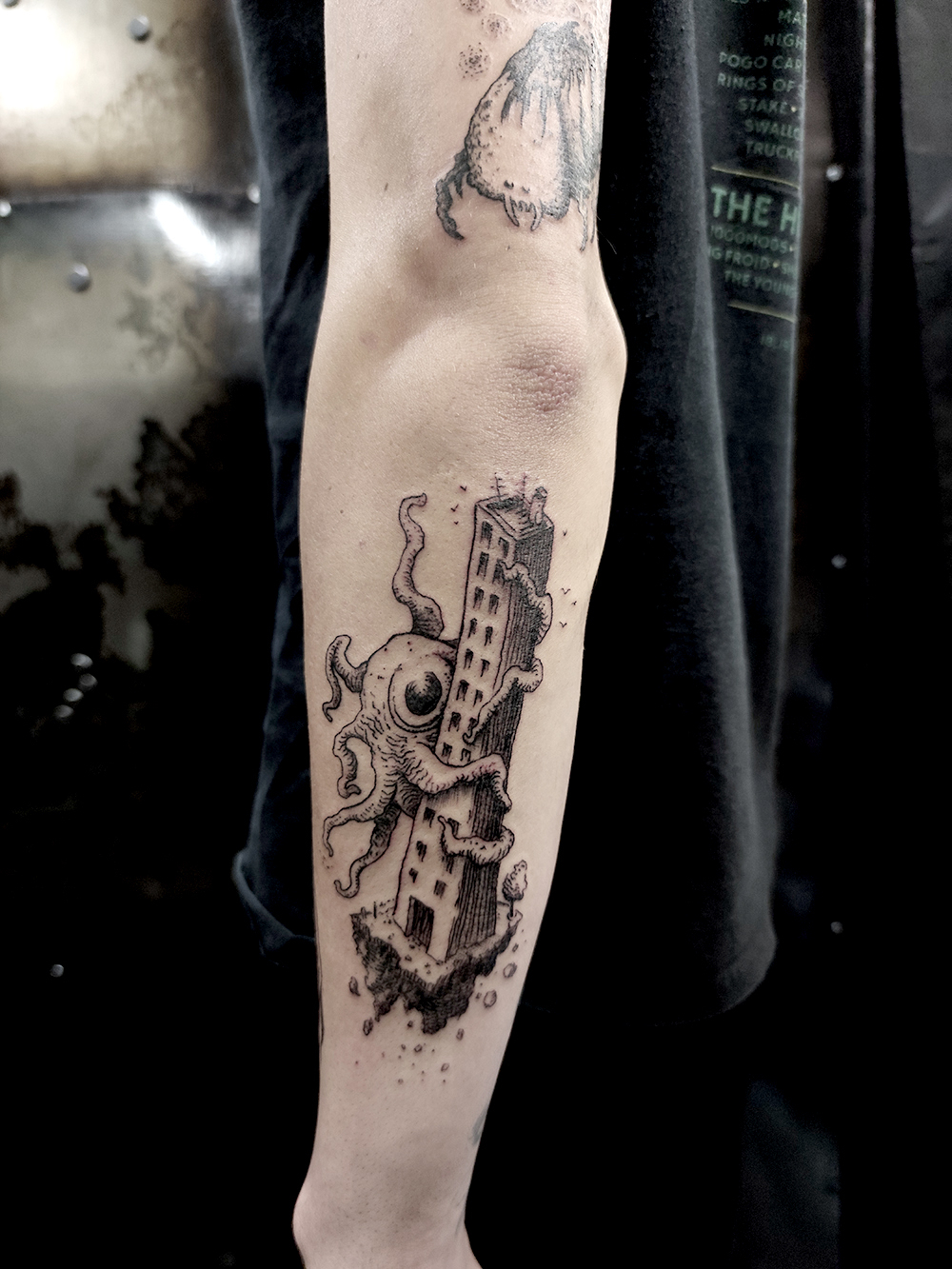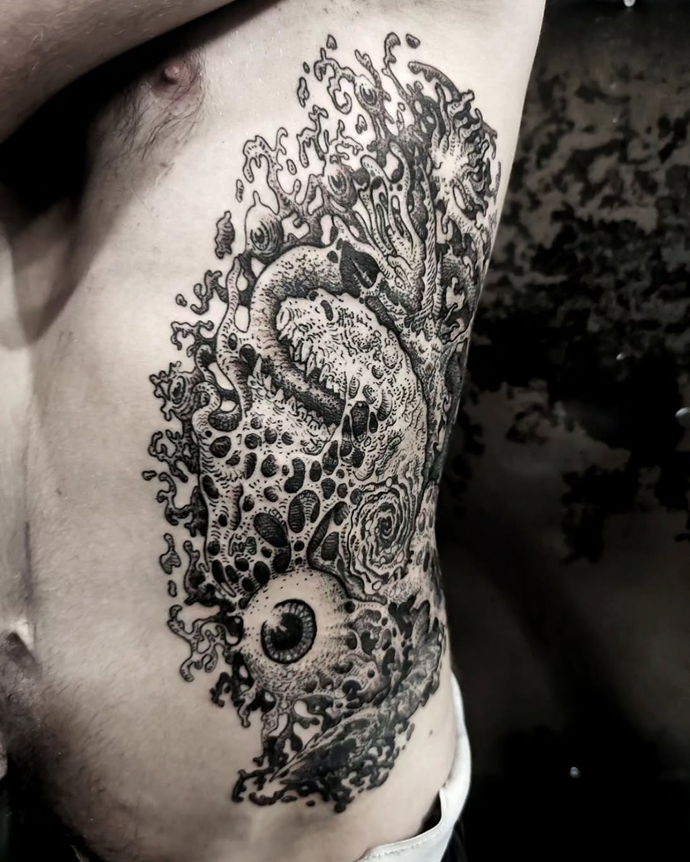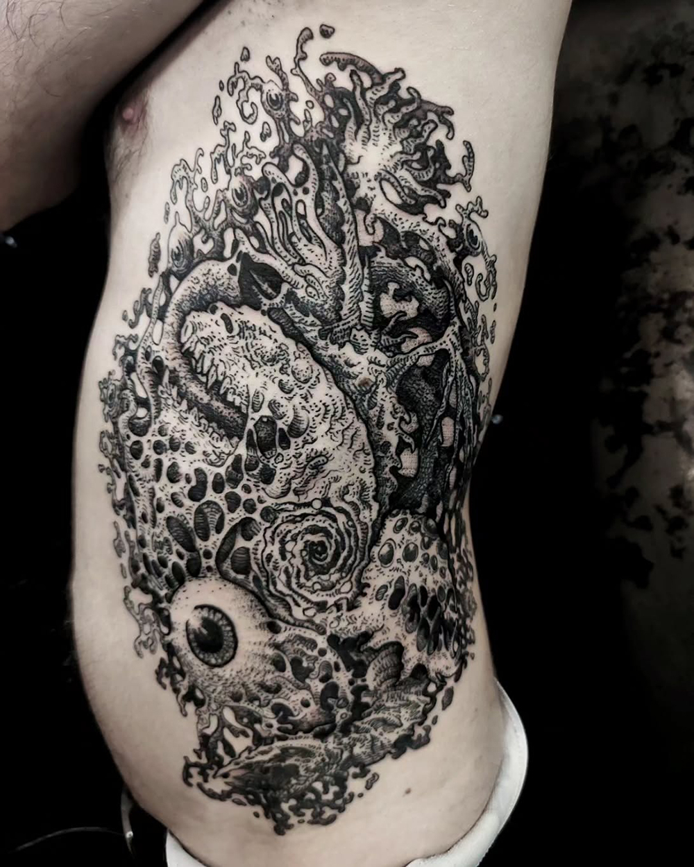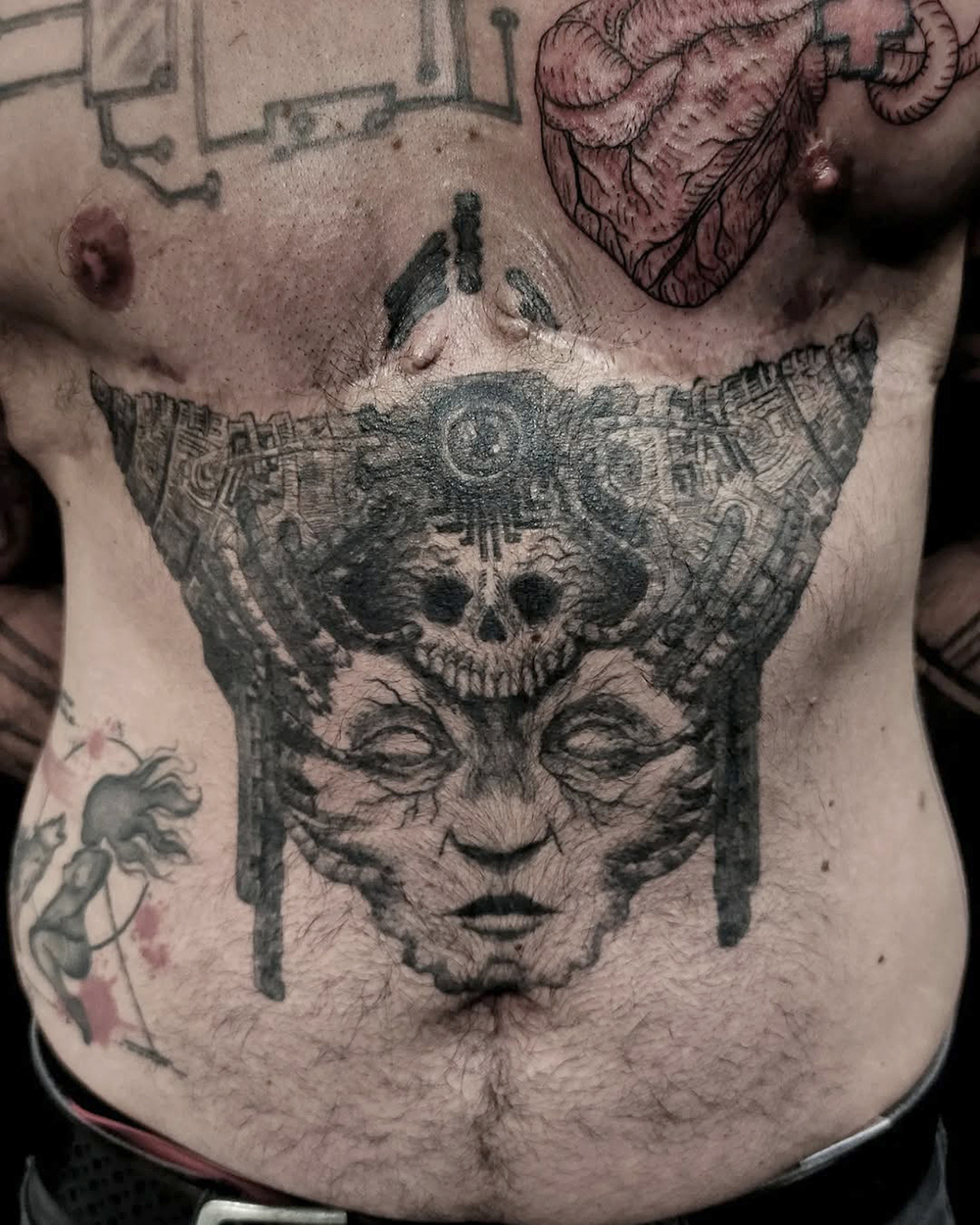 J’ai quelques thèmes de prédilection, mais je suis ouvert à tout type de projet de tatouage (j’aime faire autre chose que des monstres de temps en temps ^^). J’ai une préférence pour les projets au long cours : bras, dos, jambes complèt.e.s etc.