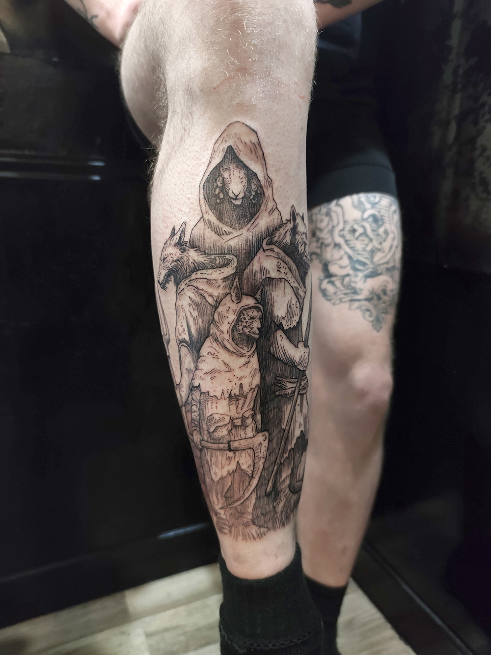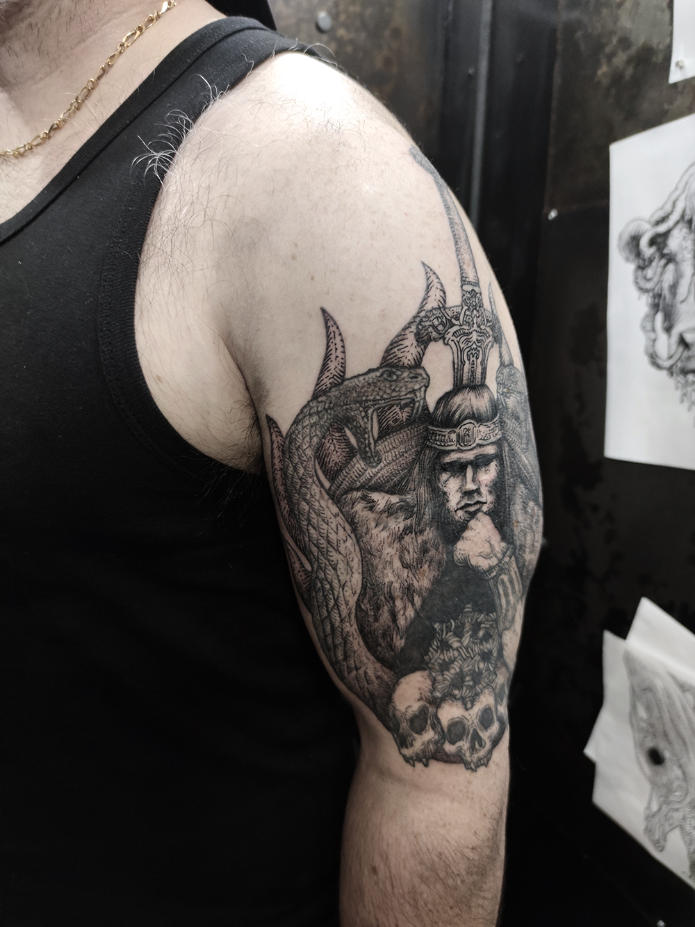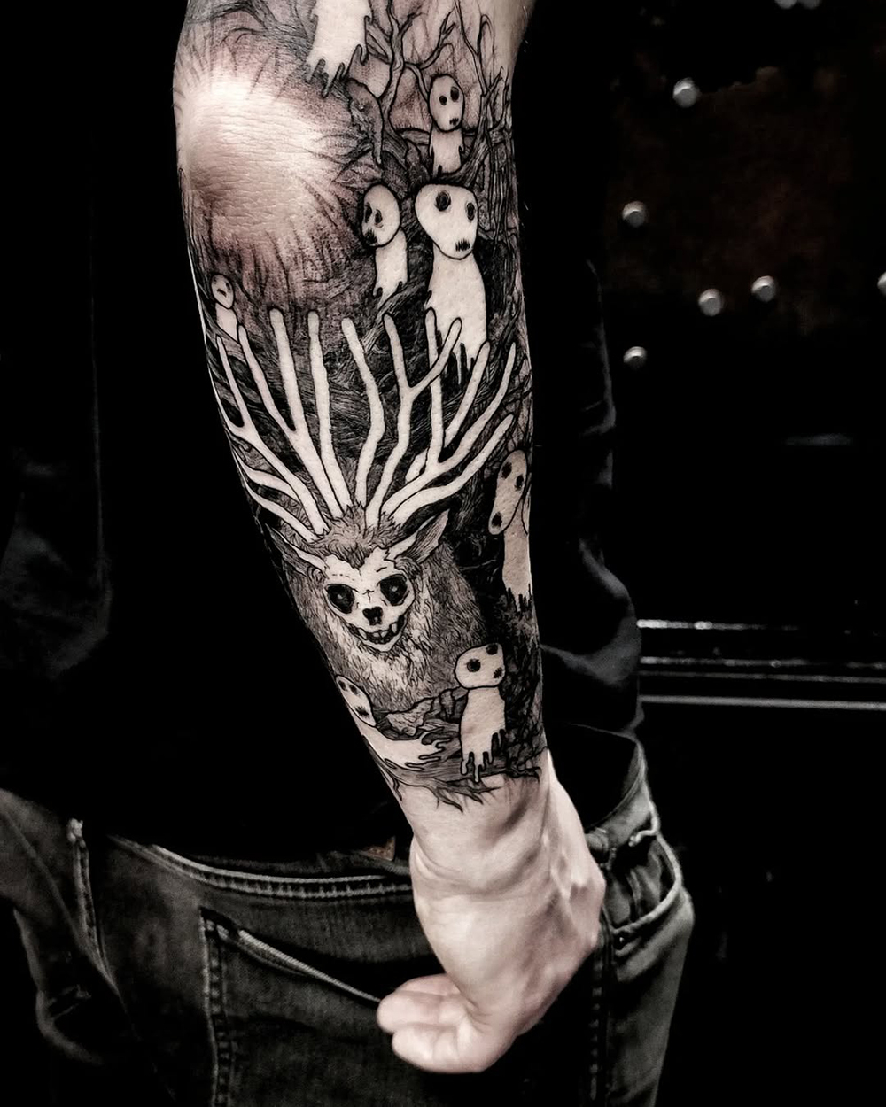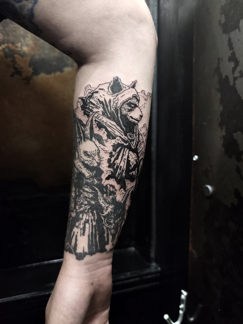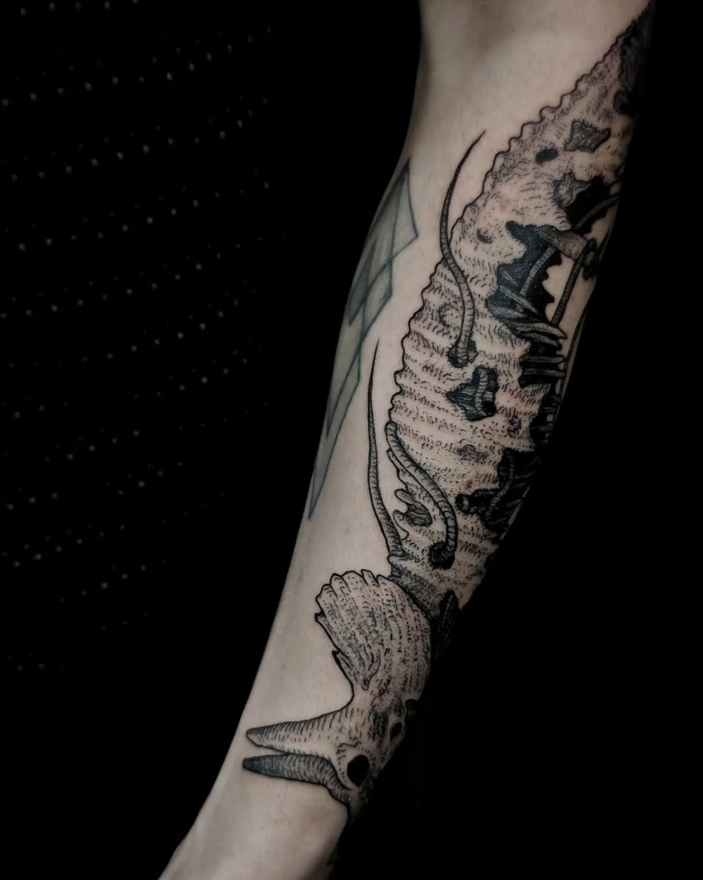J’ai quelques thèmes de prédilection, mais je suis ouvert à tout type de projet de tatouage (j’aime faire autre chose que des monstres de temps en temps ^^). J’ai une préférence pour les projets au long cours : bras, dos, jambes complèt.e.s etc.