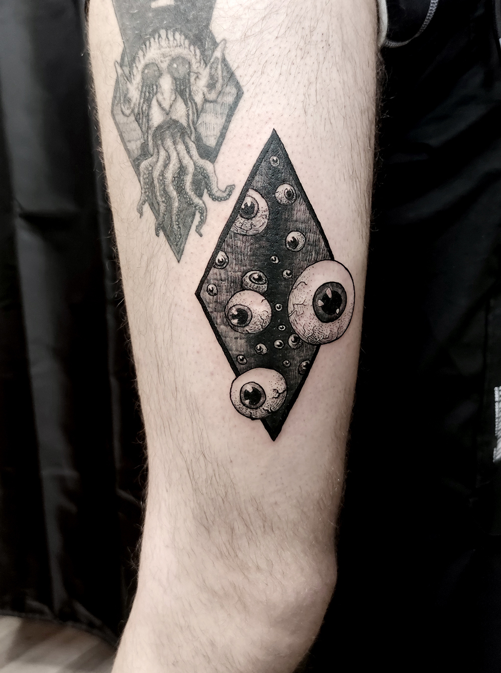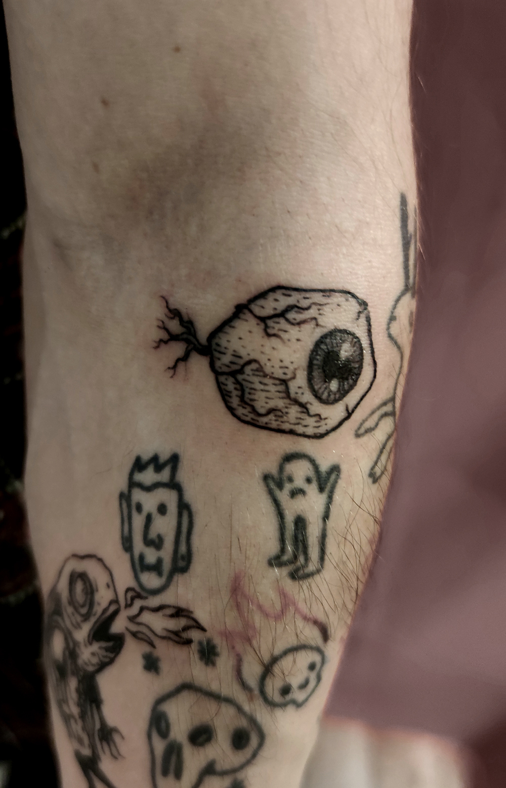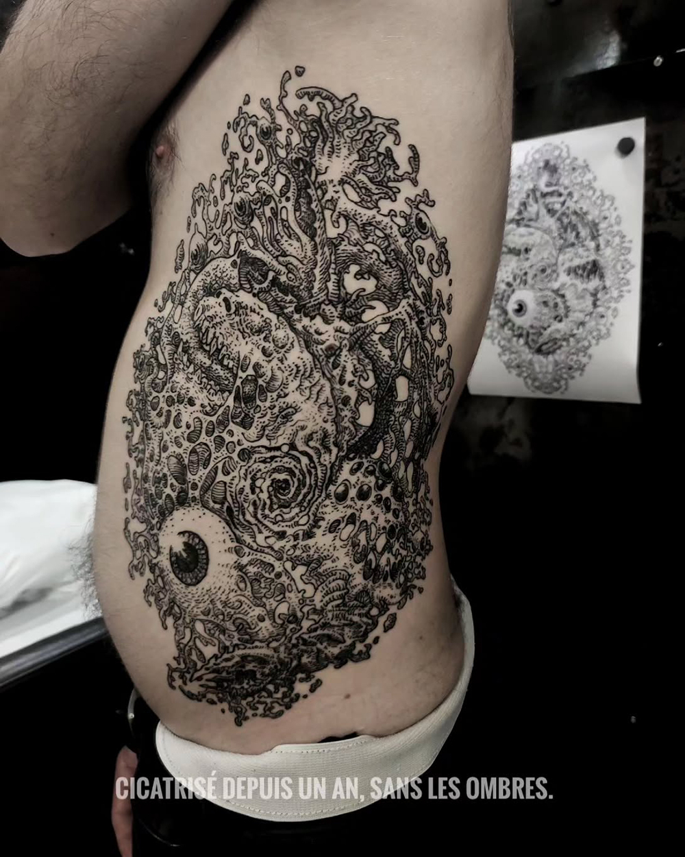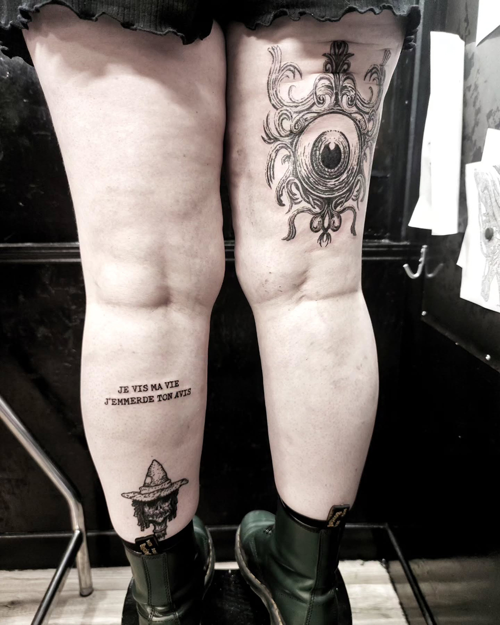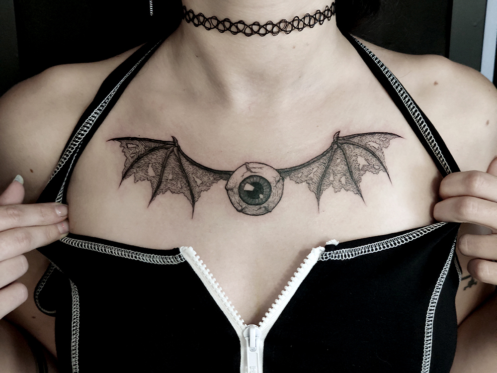 Les tattoos « moyens » ( entre un A6 et un A5 / 10 à 20cm ), surtout des flashs, un peu de freehand, un peu de custom… Beaucoup de globes oculaires…