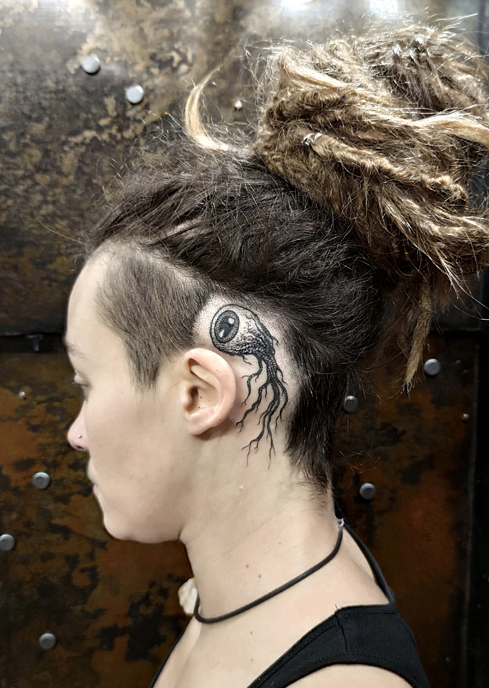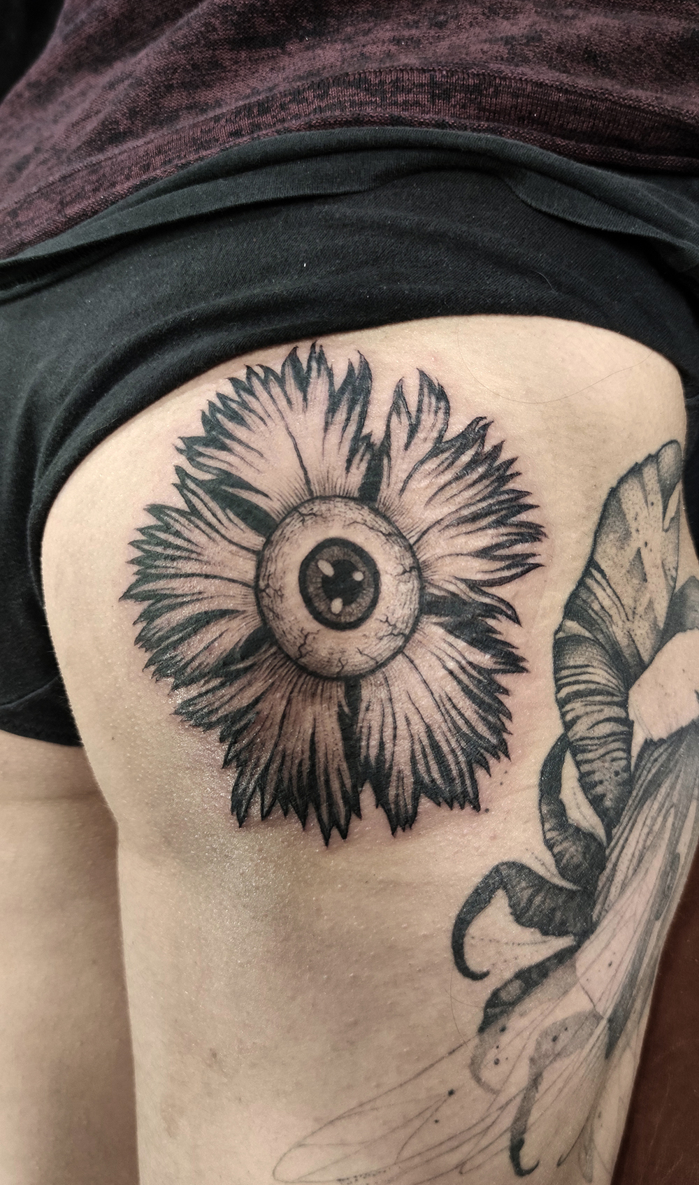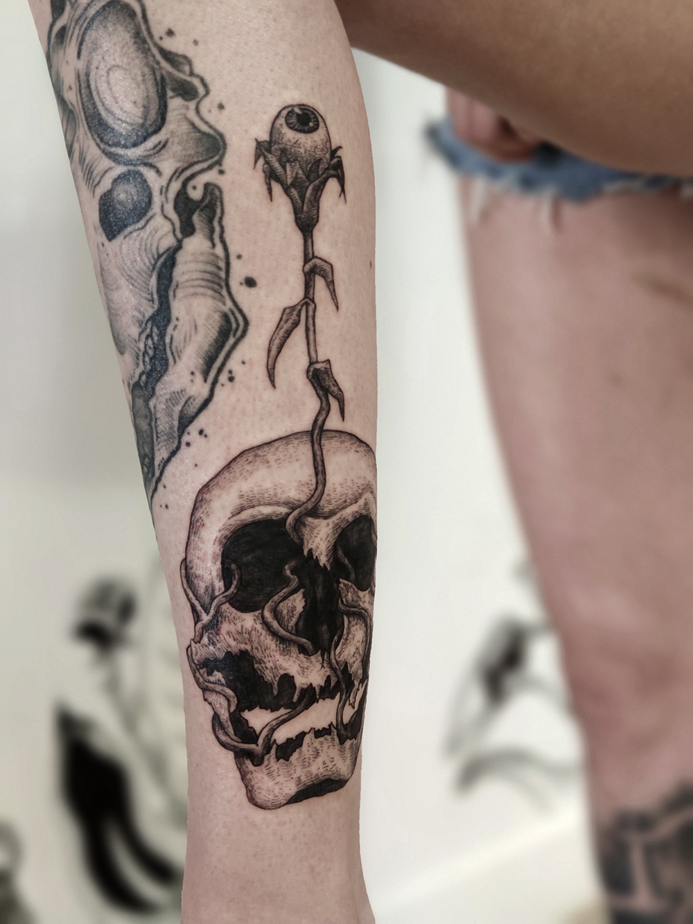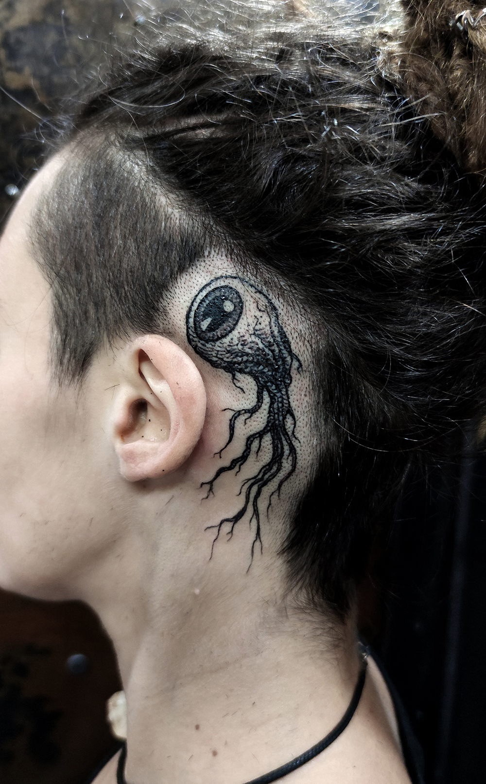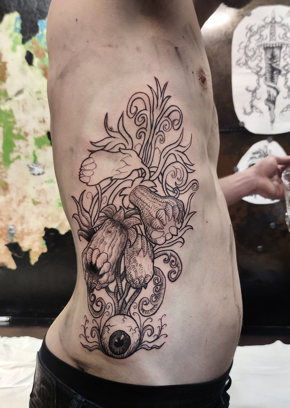 Les tattoos « moyens » ( entre un A6 et un A5 / 10 à 20cm ), surtout des flashs, un peu de freehand, un peu de custom… Beaucoup de globes oculaires…