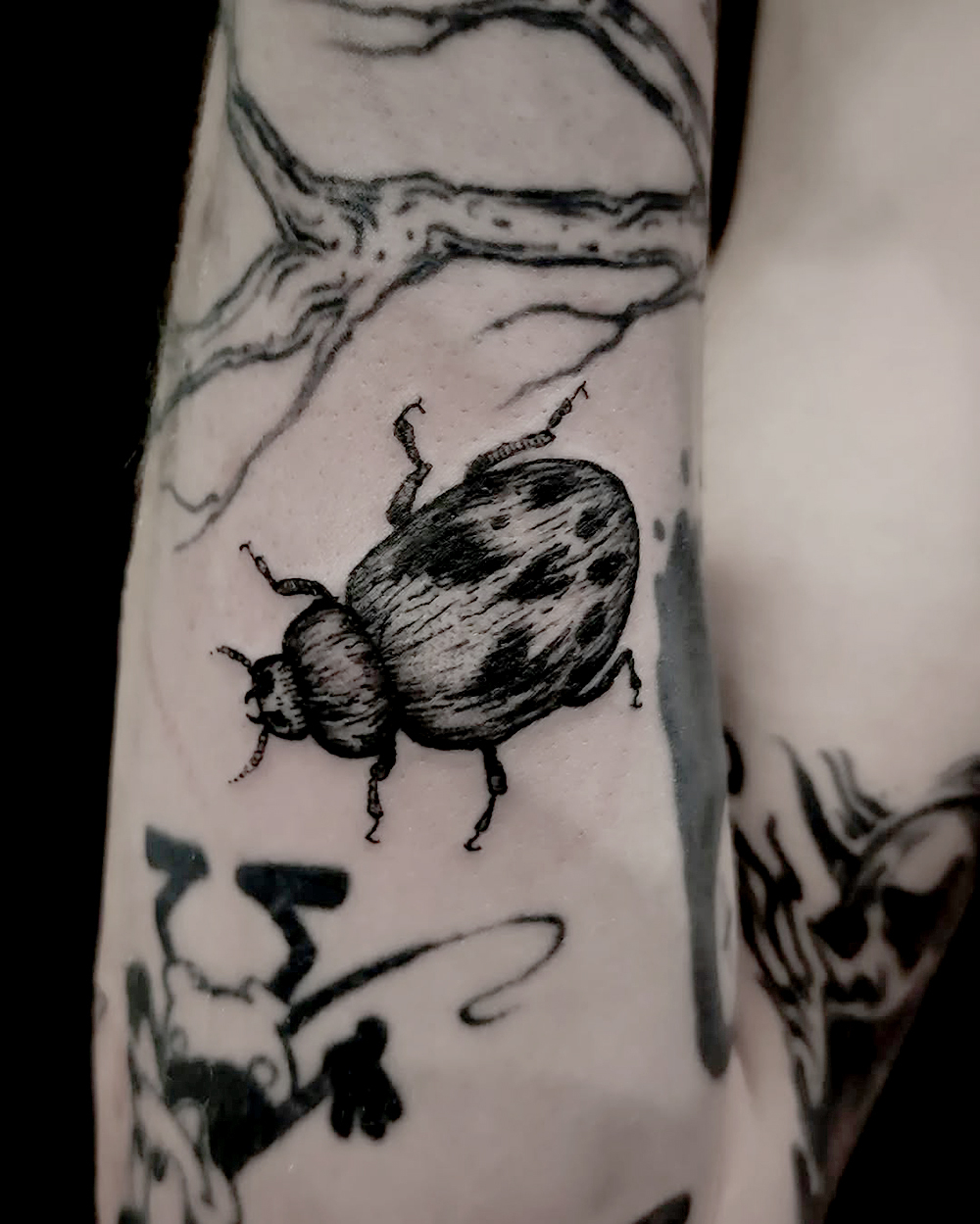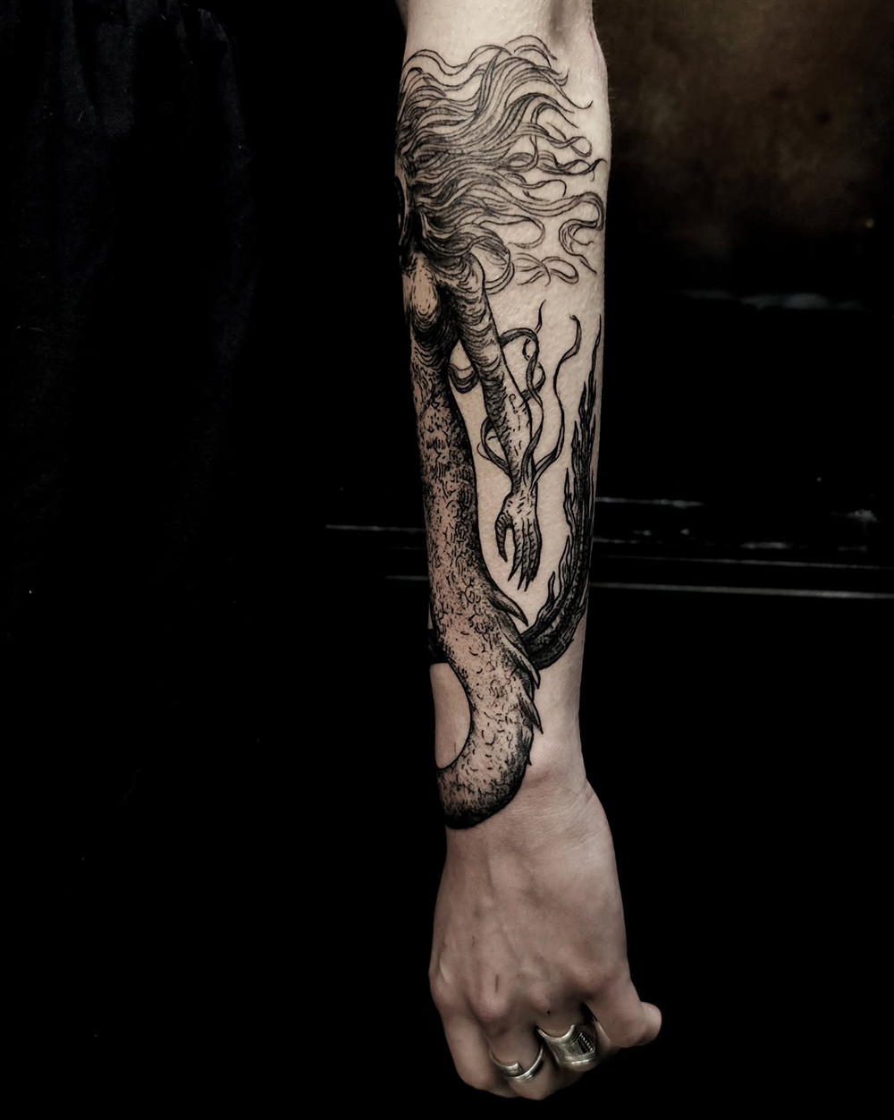 Je fais des tatouages illustratifs et/ou ornementaux, en blackwork, dans lesquels je laisse une grande place au dessin.